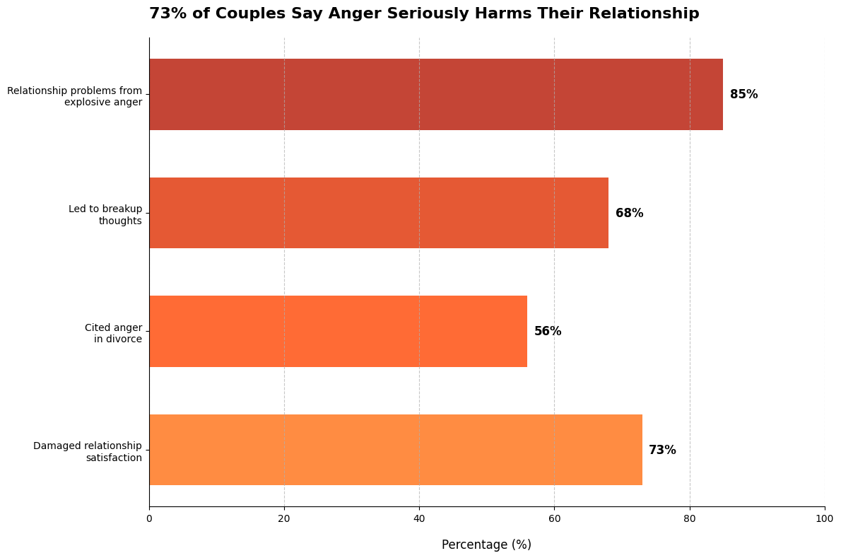 Anger's impact on relationships is stark - from damaging daily satisfaction to triggering divorce considerations. The majority of couples report serious relationship consequences from unmanaged anger, with explosive anger causing relationship problems in 85% of cases.